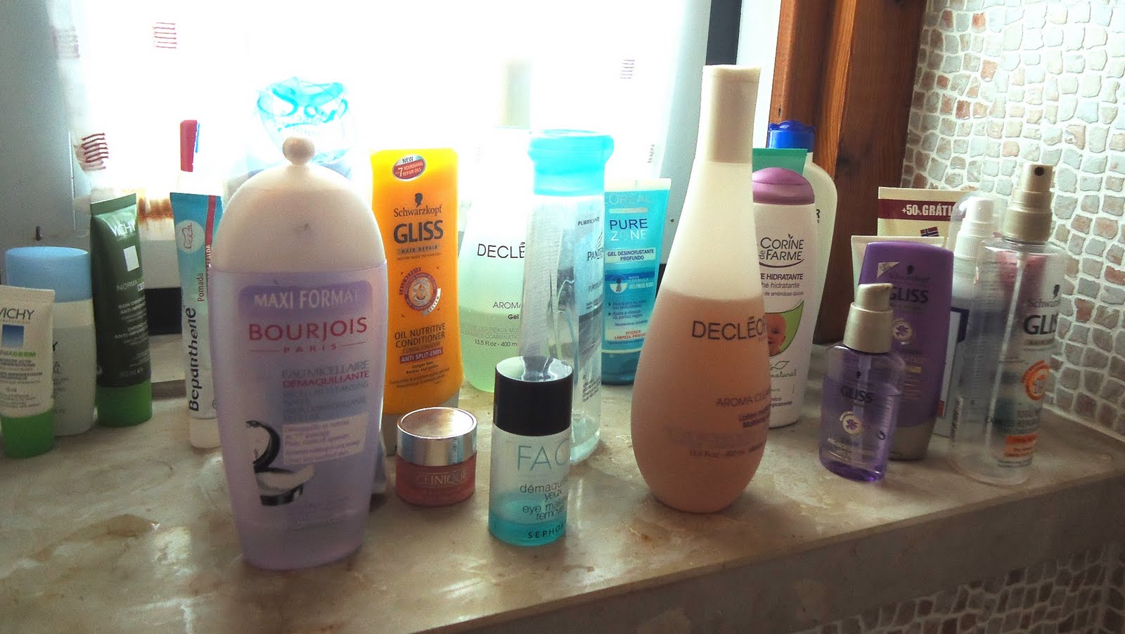 O gel de limpeza e o tónico uso da Decléor, uma marca que descobri em Andorra. O gel é, também, desmaquilhante, ou seja, além da limpeza necessária a uma pele maquilhada, mantém alguma hidratação na pele (não secando demasiado). Faz o equilíbrio perfeito! Eu pelo menos gosto porque além desse aquillibrio que causa na pele, é que o utilizo como desmaquilhante, e isso acaba por me poupar imenso trabalho (explico melhor o processo quando chegarmos a essa parte). Já experimentei os cremes da marca e não fiquei muito fascinada - o preço é bastante (!) elevado, e são demasiado oleosos para a minha pele (que ainda precisa de cuidados anti-imperfeições). As máscaras de pele da Decléor nunca comprei, mas pelas amostras que já experimentei posso dizer que me pareceram bastante interessantes. Quanto ao tónico também sou muito, muito fan - tonifica, faz uma segunda limpeza, sem secar a pele. Sinceramente recomendo bastante estes produtos a quem se identifica com o meu caso (pele mista).