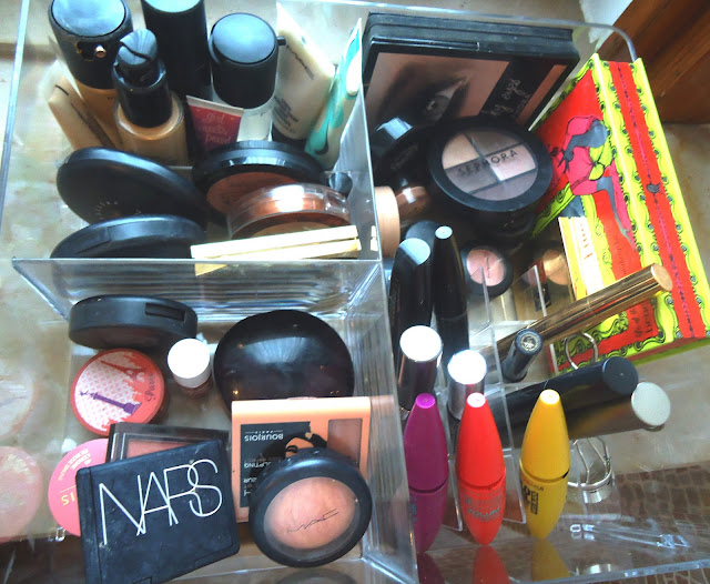 Ainda não está totalmente como quero, mas pelo menos já tenho tudo fora de bolsas e bolsinhas, todos os produtos divididos por "secções" e visíveis! E é óptimo ter tudo dividido à nossa maneira e à "à vista" - permite-nos ter noção do que temos, e permite-nos variar o tipo de maquilhagem que fazemos no dia-a-dia (quando não temos tempo para estar a pensar o que está espalhado por necessaires, etc).