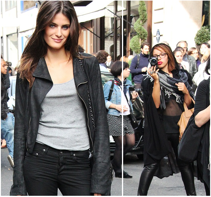 De um lado o simple&clean, característico das modelos (off-runway) - biker jackets, cinzento e preto, cara lavada, cabelos caídos, militar boots. O estilo criado fica invejável - mas como é que esta veste meia dúzia de trapos e fica perfeita?