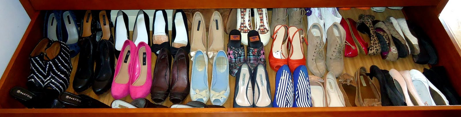 | Depois: Este lado ficaram os sapatos e as sabrinas. No outro lado ficaram as sandálias e as havaianas. Decidi usar os dois lados no gavetão, em vez de só um, e assim consigo ter tudo mais espaçado. |